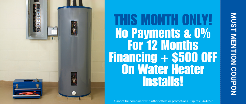 Enjoy reliable hot water and big savings! For a limited time, get $500 off your new water heater install PLUS take advantage of our 0% financing with no payments for a full year.